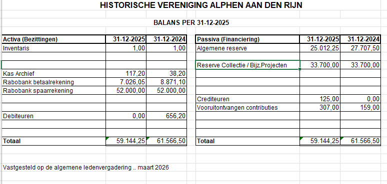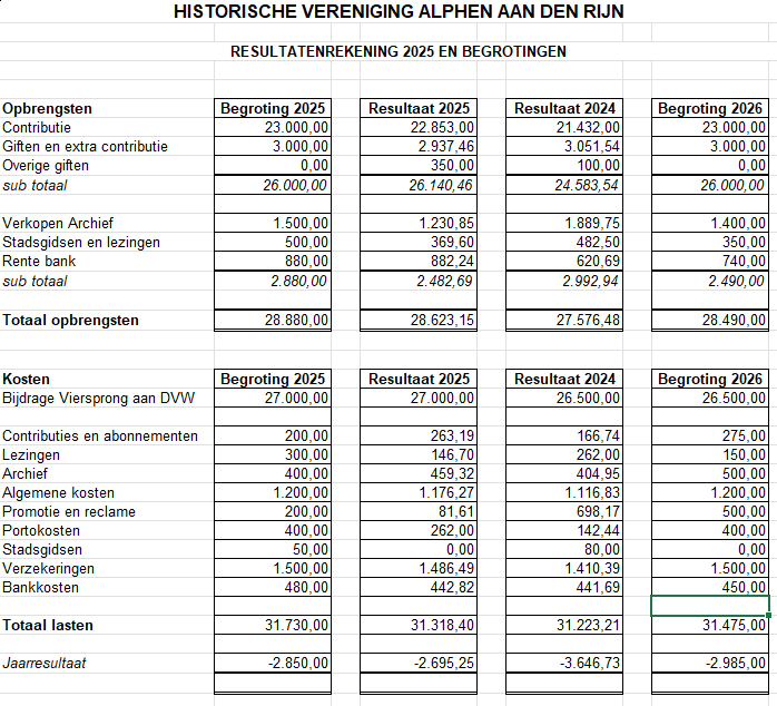 HISTORISCHE VERENIGING ALPHEN AAN DEN RIJN Toelichting op de jaarcijfers 2025 van de Historische Vereniging Alphen aan den Rijn RESULTAAT In het jaar 2025 was het resultaat € 2.695 negatief, tegen € 3.647 negatief in 2024. Het verlies was iets minder dan begroot voor dit jaar. OPBRENGSTEN Contributie De contributie-opbrengst is in 2025 hoger als gevolg van de stijging van €24 naar € 26. De contributies waren vrijwel gelijk aan de begroting. Giften De extra giften bij contributie bedroegen ruim 13 % van de contributie ; vorig jaar was dat 14 % . Er waren in 2025 2 grote eenmalige giften en die waren niet begroot Stadsgidsen Het team stadsgidsen heeft in 2025 iets minder binnen gehaald dan begroot. LASTEN Bijdrage DVW De bijdrage aan De Vergulde Wagen voor de aankoop van het blad De Viersprong dat we onze leden verstrekken is, overeenkomstig de begroting, verhoogd van € 26.500 naar € 27.000. Lezingen Ook in 2025 waren de kosten van lezingen weer lager dan in 2024. Dit is het gevolg van het houden van lezingen in samenwerking met Swaenswijk Algemene kosten Deze kosten bevatten grotendeels kosten voor vrijwilligers. Contributies Deze kosten zijn de updates voor het genealogie programma en het programma voor de ledenadministratie Archief Deze kosten stegen licht en de verkopen vanuit het archief (foto's en Viersprongen) waren lager dan in 2024. omdat in 2024 veel extra Viersprongen zijn gedrukt en verkocht aan speciale opdrachtgevers. BALANS Het verlies van 2025 ad € 2.695,25 is in mindering gebracht op de Algemene Reserve BEGROTING 2026 In totaal is de verwachting voor 2026 een uitkomst van € 2.985 negatief De bijdrage aan DVW is voor 2026 vastgesteld op € 26.500 (incl. BTW). DVW had in 2025 een winst van € 1,575 als gevolg van meevallende kosten. In 2024 een winst van € 505 In 2026 blijft de contributie gelijk aan 2025 en wel € 26. Het aantal betalende leden daalde in 2025 per saldo van 860 naar 849. De daling kon nog worden beperkt door de aanmelding van 47 nieuwe leden (vorig jaar 45). Het ledenaantal blijft het grootste aandachtspunt in verband met de financiering van de huisvestingskosten van De Vergulde Wagen (ons "clubgebouw") in de toekomst