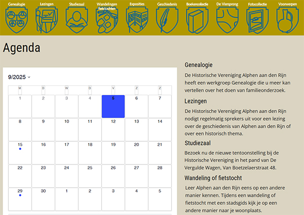 In de linker kolom staat altijd de koppeling naar de drie hoofdactiviteiten. Wandelen, Expositie en Lezing. In de midden kolom staat het hoofdartikel passend bij de nieuwsbrief en in de rechterkolom staan de andere artikelen van de maandelijkse nieuwsbrief.
