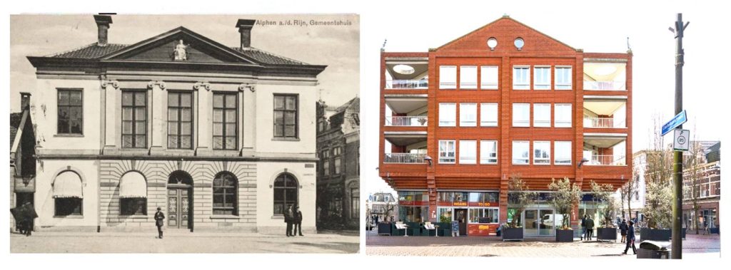 De architect van het ‘Palazzo’ heeft zich duidelijk laten inspireren door de architectuur van het oude gemeentehuis. De enige nog herkenbare bebouwing is het pand van Bahlmann (nu Eazie), uiterst rechts op beide foto’s