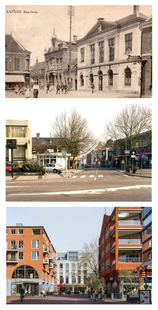 Op de bovenste foto staat, uiterst links, de winkel van kruidenier Hengeveld, later verbouwd tot Alphensche bank. In 1967 werd op die plaats een nieuw bankgebouw gezet, die door fusies uiteindelijke onder de naam ABN-AMRO verder ging. Nu staat McDonalds op diezelfde plek op de hoek van de Castellumstraat/ Julianastraat.